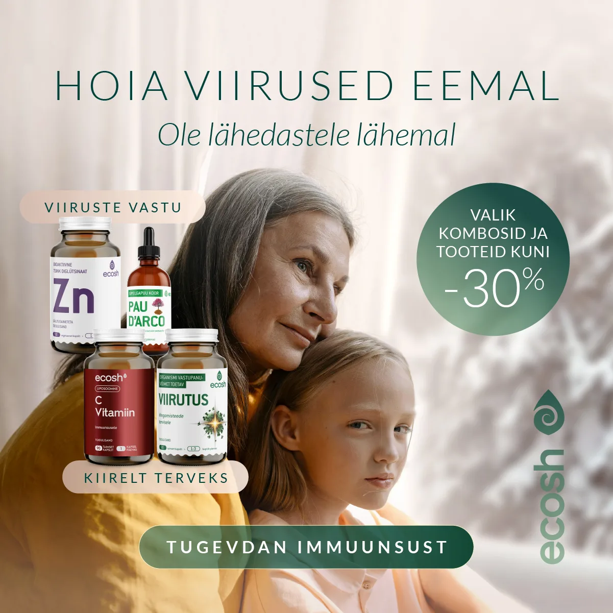 Liitu Ecoshi uudiskirjaga! Toeta oma tervist ja saa esimene tellimus 10% soodsamalt! Soovin liituda Ecoshi Boonusprogramm Ecoshi püsikliendina kogud igalt ostult 5% boonust oma kontole!Kasuta kogutud boonust e-poes maksmisel. Loo konto Logi sisse Osta 100 € eest ja säästa -10% *Kupong ei kehti toodetele millel on juba allahindlus! Sooduskood immuunsus10 E-poodi Osta 150 € eest ja säästa -15% *Kupong ei kehti toodetele millel on juba allahindlus! Sooduskood immuunsus15 E-poodi