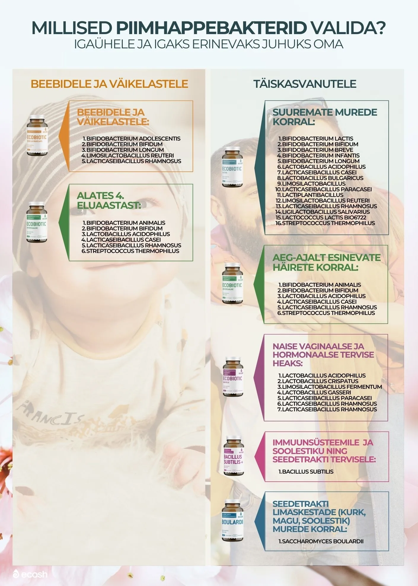 Ecoshi kvaliteetsed ja inimesele omased piimhappebakterid on kasvatatud Prantsusmaal, kontrollitud ja valikus sisaldub piimhappebakterite kombinatsioone igaühele ja igaks olukorraks.